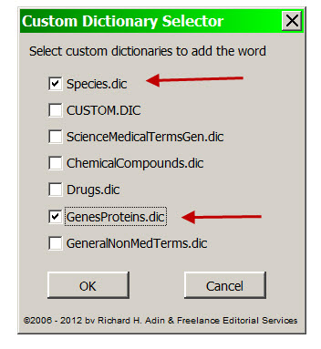 After choosing to add a word to a custom dictionary, the following Custom Dictionary Selector dialog appears. This Selector replaces the confirmation screen of previous versions and shown above. Just select the dictionary or dictionaries to which you want the word added and click OK.