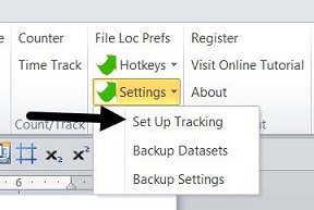 Tracking Button OptionsIf you want to change the default text, symbol, or both, go to the Preferences menu on the EditTools Ribbon, click Settings > Set Up Tracking (arrow). Clicking Set Up Tracking brings up the dialog shown below. For a different message, change the text in the ON and OFF fields (#3). For different symbols, click here and select the symbols you prefer and enter the symbol names in the appropriate field (#4). For example, if you would prefer that the OFF symbol be a hand with palm facing you (the "stop" hand), in the Tracking OFF image: field, delete SkipOccurrence and enter Breakpoint. |